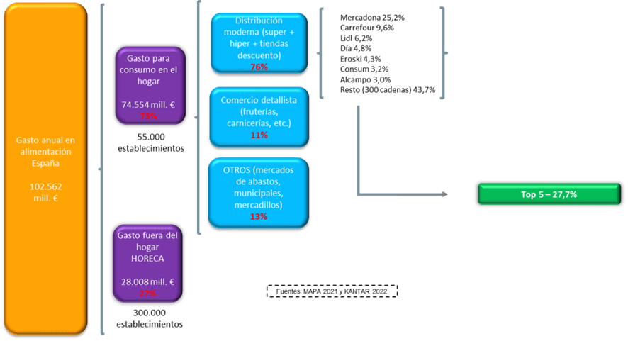 En el año 2021, los españoles gastamos 102.562 millones de euros en alimentación, según el Ministerio de Agricultura, Pesca y Alimentación. De ellos, el 27 por ciento lo gastamos fuera del hogar (en restaurantes, bares, cafeterías, hoteles, etc.) y el 73 por ciento lo hacemos para consumir o cocinar en casa. Dentro del canal de consumo para el hogar, existe una gran variedad de formatos y canales a través de los cuales el consumidor accede a los productos de alimentación. El 76 por ciento de estas ventas se producen a través del canal de la distribución organizada (autoservicios, supermercados e hipermercados) y el 24 por ciento a través de otros canales como es el comercio detallista (carnicerías, pescaderías, fruterías, panaderías, etc.), los mercados de abastos, los mercados municipales, los mercadillos e, incluso, la red internet.